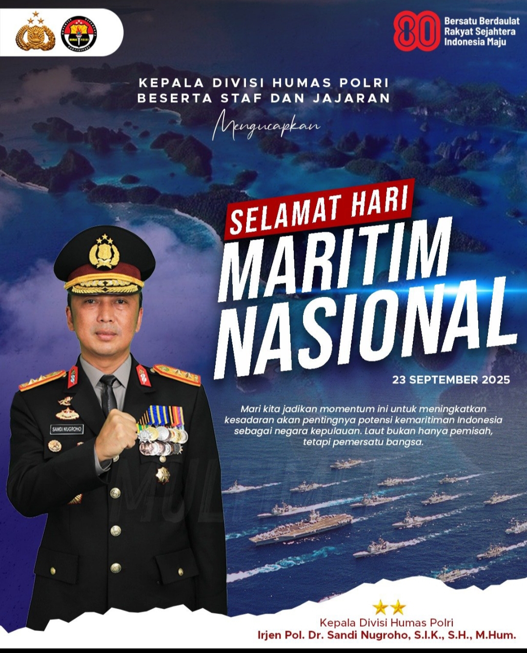 Jakarta – //DJALAPAKSINEWS // — (24/09/2025), Peringatan Hari Maritim Nasional tak sekadar seremoni belaka. Kepala Divisi Humas Polri, Irjen Pol. Dr. Sandi Nugroho, S.I.K., S.H., M.Hum., pada hari kemarin menegaskan bahwa laut adalah urat nadi bangsa dan harus dipandang sebagai kekuatan pemersatu, bukan sekadar pemisah antarwilayah.