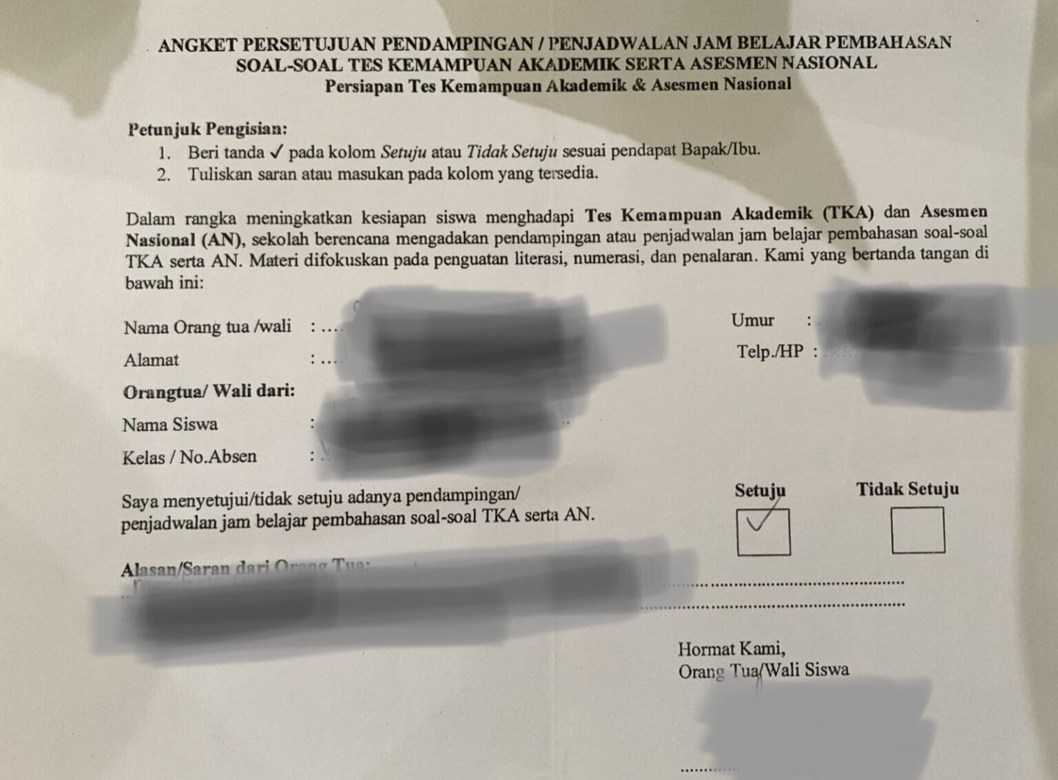 Sebelumnya, sejumlah Wali murid mengaku mendapatkan edaran angket yang dibagikan pihak sekolah. Angket tersebut berisikan persetujuan pendampingan program Tes Kemampuan Akademik (TKA) dan Asesmen Nasional bagi murid yang ingin melanjutkan ke jenjang SMA. Mereka kemudian mengaku terkejut, lantaran angket itu menjadi dasar persetujuan sumbangan wajib.