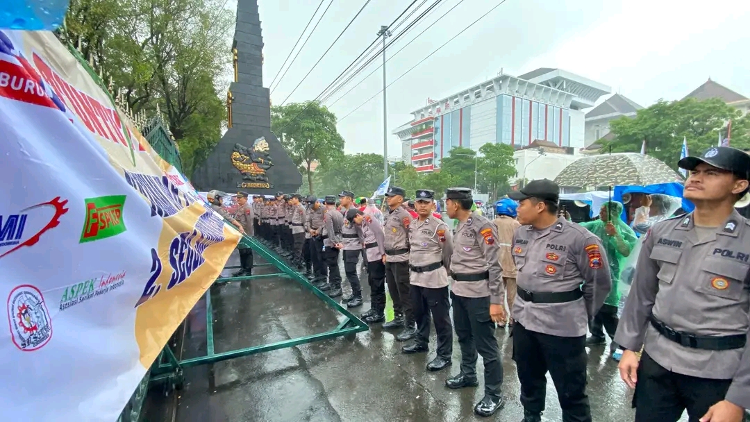 Semarang – //DJALAPAKSINEWS// – Di tengah rintik hujan yang mengguyur Kota Semarang sejak pagi, jajaran Polrestabes Semarang tetap menunjukkan dedikasi tinggi dalam mengawal aksi unjuk rasa Aliansi Buruh Jawa Tengah, Rabu (22/10/2025). Pengamanan dilakukan di dua titik utama, yakni Kantor Dinas Tenaga Kerja dan Transmigrasi (Disnakertrans) Provinsi Jawa Tengah serta Kantor Gubernur Jateng di Jalan Pahlawan.